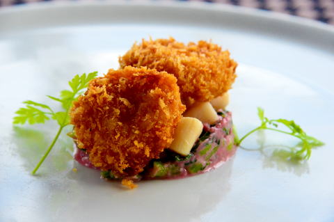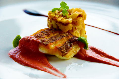 蓮根とマスタード ビーツのソース カリッと真鯛